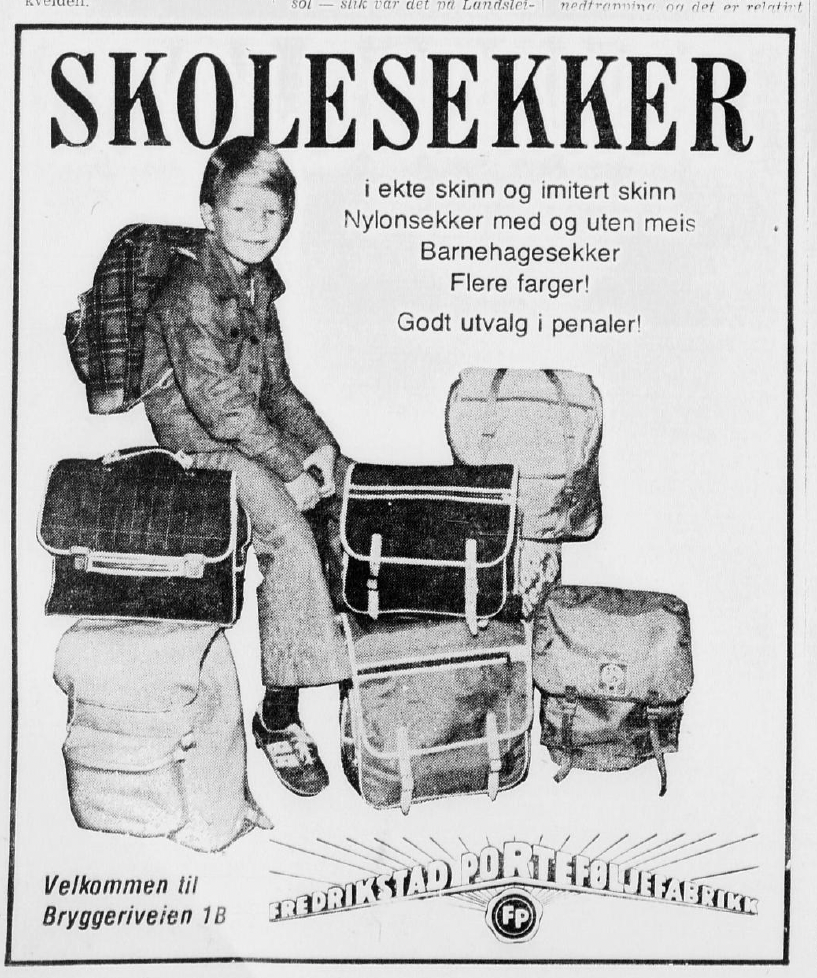 Bildetekst: Da Per Jørgen Foss var 6 år gammel stilte han i en annonse for skolesekker for Fredrikstad Porteføljefabrikk.